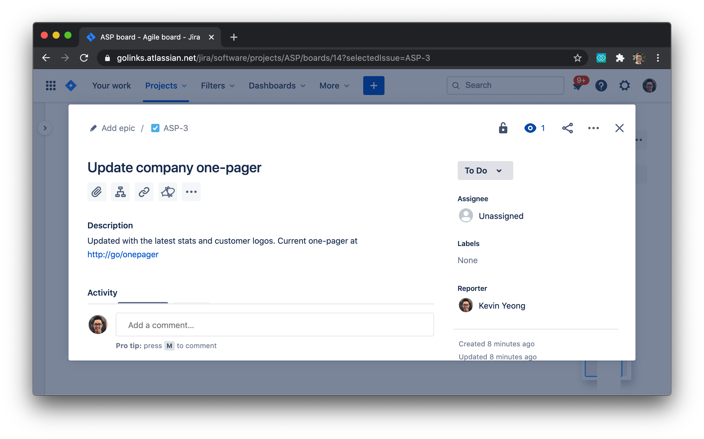 • Faster navigation to important boards - Why click around in Jira when you can quick navigate to your favorite boards? Find what you’re looking for faster with golinks that you can remember.